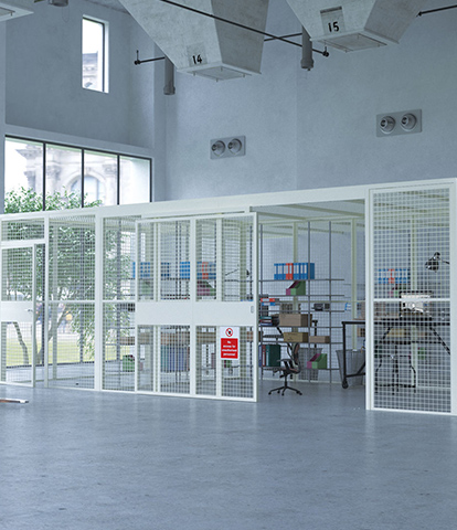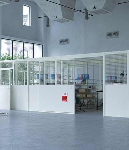 Panels are constructed from 43 x 43 x 1.2 mm (18g) cold-rolled angles and 32 x 32 x 0.7 mm (22g) cold-rolled T bars. Panels are available in solid, mesh or solid/glazed/solid elevations.